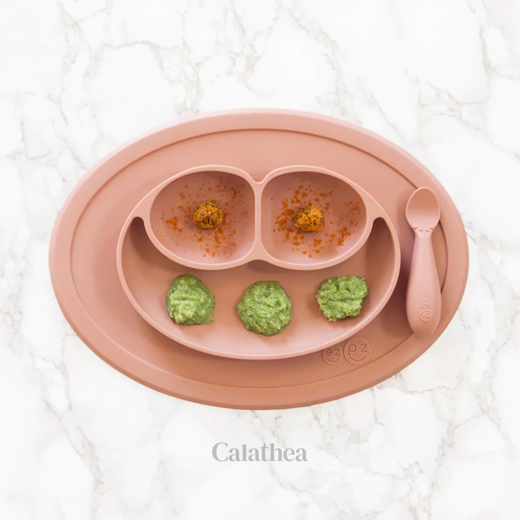Es un mantel individual + plato de tres divisiones, con mini cubiertos (cuchara/tenedor). Su base antideslizante permite que se adhiera a cualquier superficie plana. Es super estable y a prueba de caídas. Tiene un tamaño ideal para las mesas de las sillitas y para llevar de viaje.
